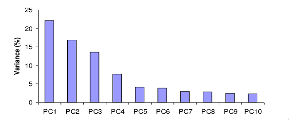 Obtidos os valores e vetores próprios da matriz de covariância, podemos inferir algo sobre a variância dos dados. Os vários valores próprios indicam a variância pela qual o atributo que representam é responsável. Assim, temos a seguinte relação