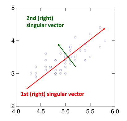 Os vetores próprios de cada componente indicam a direção de máxima variância. O vetor próprio correspondente ao maior valor próprio aponta na direção de máxima variância. O segundo vetor próprio refere a direção de máxima variância, não contando com o primeiro vetor. Este padrão continua para os vetores próprios. É de notar que os valores próprios são todos perpendiculares entre si.