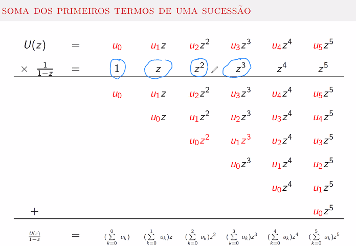 Se U eˊ a func¸a˜o geradora da sucessa˜o un, enta˜o a func¸a˜o geradora da sucessa˜osn=i=0∑nui (somas parciais de un)eˊ:S(z)=1−zU(z)
