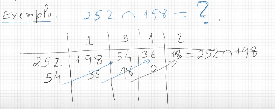Primeiro passo é ver quantas vezes 198 cabe em 252 — 1 vez. Segundo passo é calcular o resto dessa divisão — 54. Depois, repete-se o procedimento mas desta vez com 198 e 54, e assim sucessivamente, até obtermos um resto zero. Neste caso, 18 seria o M.D.C. entre 252 e 198.