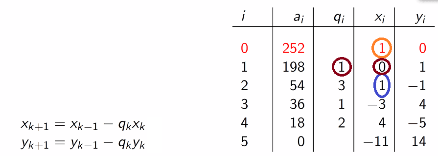 Como a construir? Imaginemos que queremos o coeficiente circulado a azul. Para obtermos este coeficiente, basta pegar no que vem duas linhas acima, ou seja o laranja, e subtrai-se ao produto entre o quociente na linha de cima — qi — e o valor de xi/yi também na linha acima. Neste caso, tem-se 1−(1⋅0)=1. Como resultado, após descobrir que 18 é o M.D.C entre 252 e 198, vem: