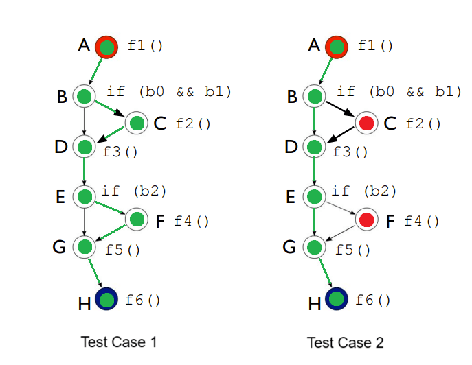Verifica-se que, para executar 100% das linhas do programa, basta ter o Test Case 1, o que nos dá uma Statement Coverage completa, enquanto o Test Case 2 apenas excuta 75% das linhas.