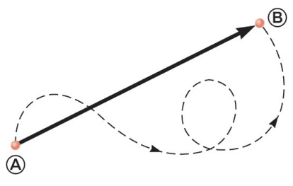 - Deslocamento: é o vetor que une o ponto A ao ponto B. É uma linha reta e independente do caminho.