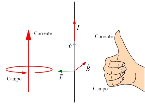 A Força (de Lorentz) que age sobre o fio pode ser descrita como o produto externo entre a Velocidade de uma carga e um Campo Magnético que anda em círculo em torno do fio