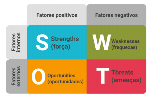 Uma vez feita a análise externa e interna e recolhidas as principais forças (strengths, S), fraquezas (weaknesses, W), oportunidades (opportunities, O) e ameaças (threats, T) podemos reuni-las numa matriz SWOT que serve de base à formulação de estratégias: