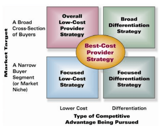 “Best-Cost Provider”: Tentar seguir simultaneamente uma estratégia de Liderança de baixo-custo e de Diferenciação. Os clientes-alvo serão aqueles que atribuem valor à diferenciação mas têm em atenção se pagam um preço baixo – "value for money".