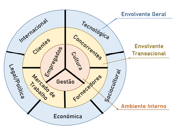 A envolvente geral interage com todas as organizações da mesma área de atividade de forma exógena, i.e., as empresas não conseguem influenciar este envolvente. Este é composto pelos fatores PESTL, da envolvente nacional e internacional: