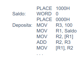 conta: ADD R1, R2 ; soma ao saldoSabemos que conta representa a nossa etiqueta, ADD a mnemónica, R1 e R2 são os operandos, e soma ao saldo é o nosso comentário em relação ao que é que a nossa linha de comando faz.