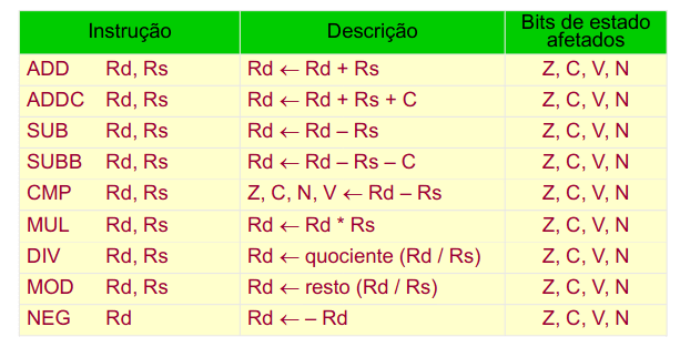 As instruções aritméticas são todas as instruções que lidam com números em complemento para 2, nomeadamente ADD, SUB, CMP, MUL e DIV.