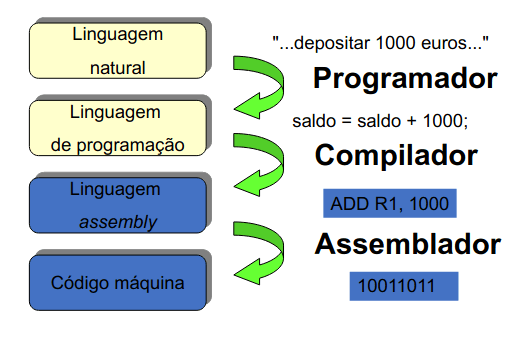 Para escrevermos um programa começamos com a nossa linguagem natural para descrever o nosso objetivo seguido da sua tradução para linguagem de programação. Estes dois passos são obtidos pelos programadores. Assim que temos o nosso programa escrito, o compilador traduz para linguagem assembly e, por último, o assemblador traduz tudo para código máquina.