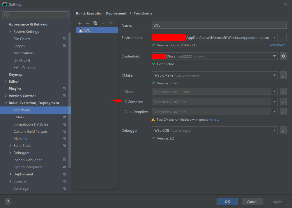 Pode acontecer o compilador de C não ser detetado automaticamente. Caso isso aconteca, coloquem /usr/bin/gcc na definições do CLion, como na imagem abaixo. O Make e o C++ compiler não são importantes para a programação em C.