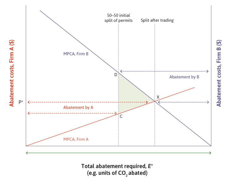 As empresas podem também vender e comprar as licenças entre si, criando assim um mercado. As empresas negoceiam até o preço atingir o equilíbrio (resultado pareto-eficiente) e a redução é feita pelas empresas com menor custo de abatimento.