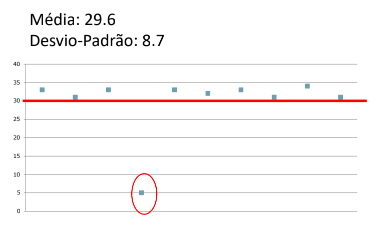 Se recorrermos ao mesmo teste, mas em vez de 10 utilizadores, tivermos 20 utilizadores, já será mais difícil ter uma média perto de 30 segundos, se só houver um outlier. Porém, se houver mais do que um, então já será mais complicado obtermos uma média correta.