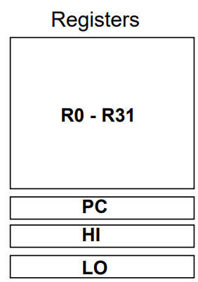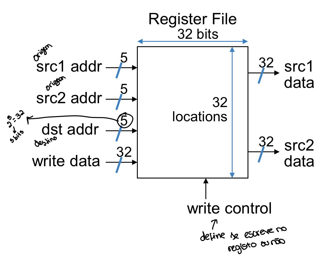 O MIPS tem registos. O banco de registos tem portas de leitura e porta de escrita, o que nos permite ler valores de dois registos e, simultaneamente, escrever um valor num registo. Cada registo armazena uma palavra de bits, isto é, bytes.