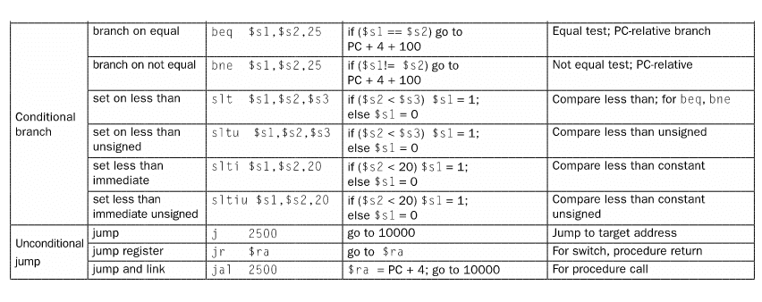 Existem apenas duas instruções de branch, uma para igualdade e outra para desigualdade: