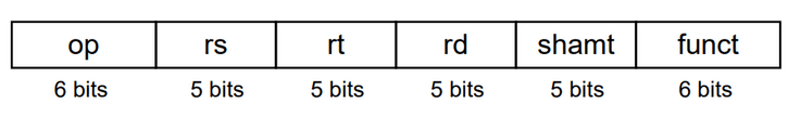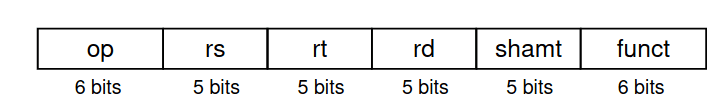 op: código de operação - opcoders: número do primeiro registort: número do segundo registord: número do registo de destinoshamt: quantidade de shift ("00000", por agora)funct: código de função - extensão do opcode