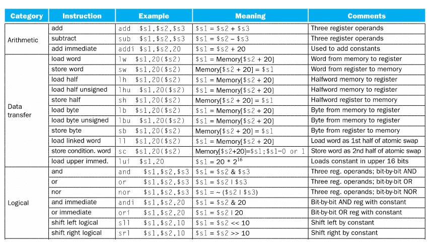 lw $s2, 4($t0) # endereço 0x53Além disso, existem várias variações destas instruções, que nos permitem carregar/guardar half-words e bytes, tais como load byte, load byte unsigned, load half-word, load half-word unsigned, store byte e store half-word.