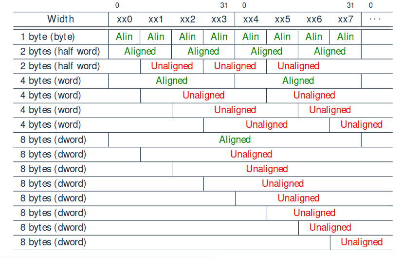 A memória do MIPS é endereçada em bytes, ou seja, cada endereço identifica 8 bits. É muito importante que as palavras estejam alinhadas em memória com um endereço que seja um múltiplo de quatro, de forma a preservar a eficiência do processador e evitar bugs. Usualmente, o compilador trata disto por nós.