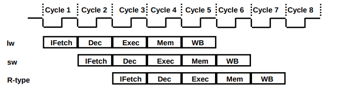 São mantidos registos entre os andares do pipeline, para controlo. A cada ciclo de relógio, a execução passa de um andar da pipeline para outro. Tal significa que o tempo de duração de um ciclo corresponde ao tempo de execução do andar mais lento. Por exemplo, se todas as etapas demorarem 200ps e a etapa de MEM tiver uma duração de 250ps, cada ciclo de relógio levaria 250ps. É de notar que caso não houvesse pipelining, cada ciclo de relógio corresponderia à soma da duração de todas as etapas, neste caso 1050ps.