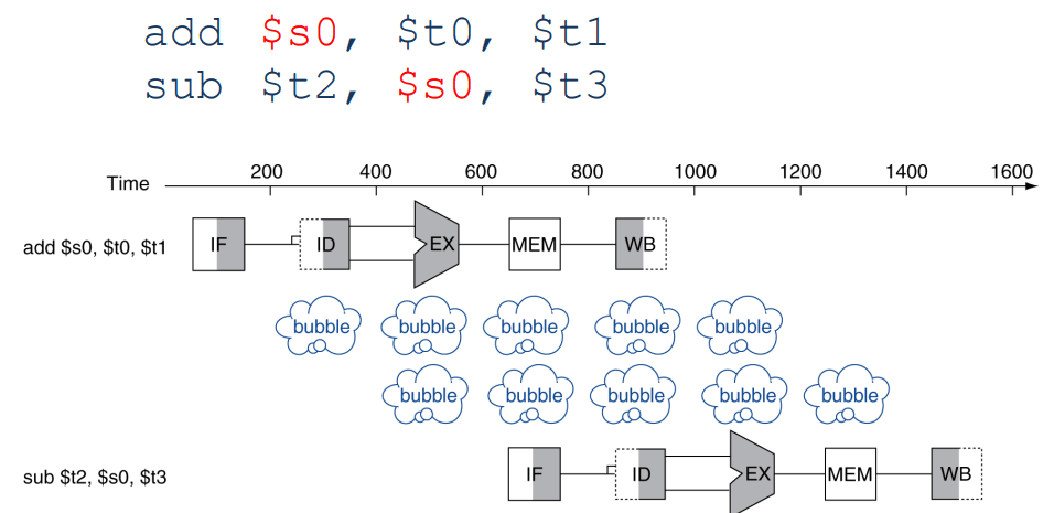 até que este valor fosse escrito no registo $s0, no andar WB, para que a segunda instrução