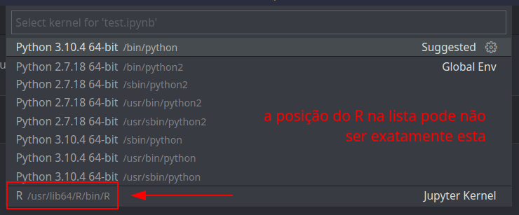 install.packages("IRkernel")para instalar o IRKernel, o pacote necessário para o funcionamento do Jupyter Notebook com R; - Correr
