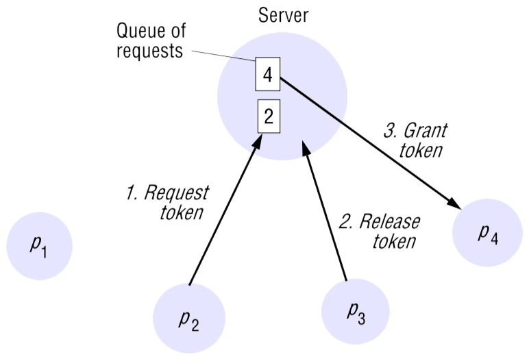 Para entrar na secção crítica, um processo envia um pedido ao servidor e aguarda uma resposta deste. Conceptualmente, a resposta é uma chave que significa permissão para entrar na secção crítica. Se nenhum outro processo tiver a chave, então o servidor responde imediatamente, concedendo a chave. Se a chave estiver detida por outro processo, então o servidor não responde, mas coloca o pedido numa fila de espera. Quando um processo sai da secção crítica, envia uma mensagem ao servidor, devolvendo-lhe a chave.