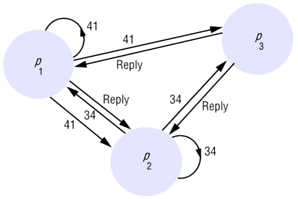 Para ilustrar o algoritmo, considere uma situação envolvendo três processos, , e , conforme mostrado na figura. Vamos supor que não está interessado em entrar na secção crítica, e que e solicitam entrada simultaneamente. O timestamp do pedido de é 41, e o de é 34.
