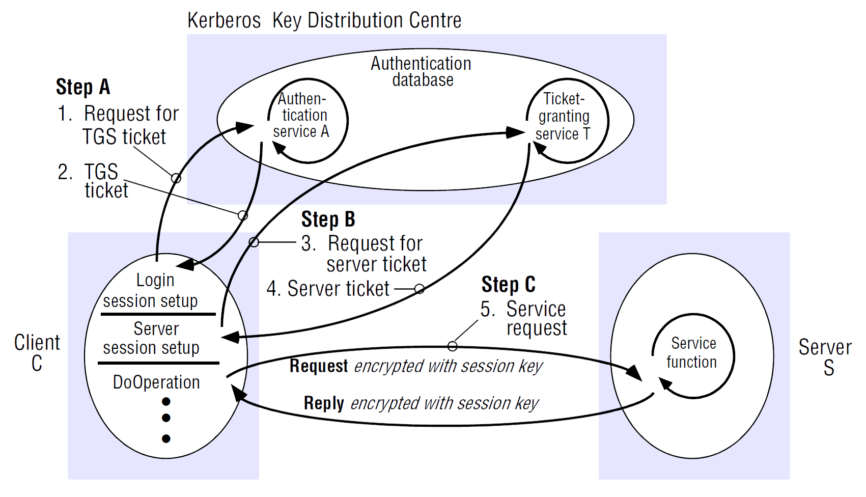 - o servidor auxilia o cliente no estabelecimento de um canal seguro entre este e os servidores, sem necessitar de repetir o processo de autenticação