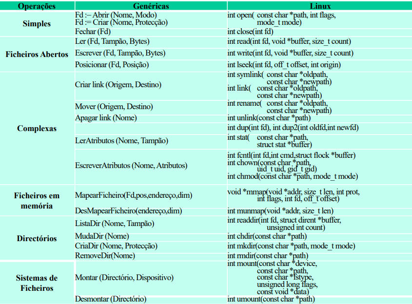 - Os objetos que o SO gere são acessíveis aos processos através de descritores de ficheiro, como por exemplo ficheiros, diretorias, dispositivos lógicos, canais de comunicação, etc;