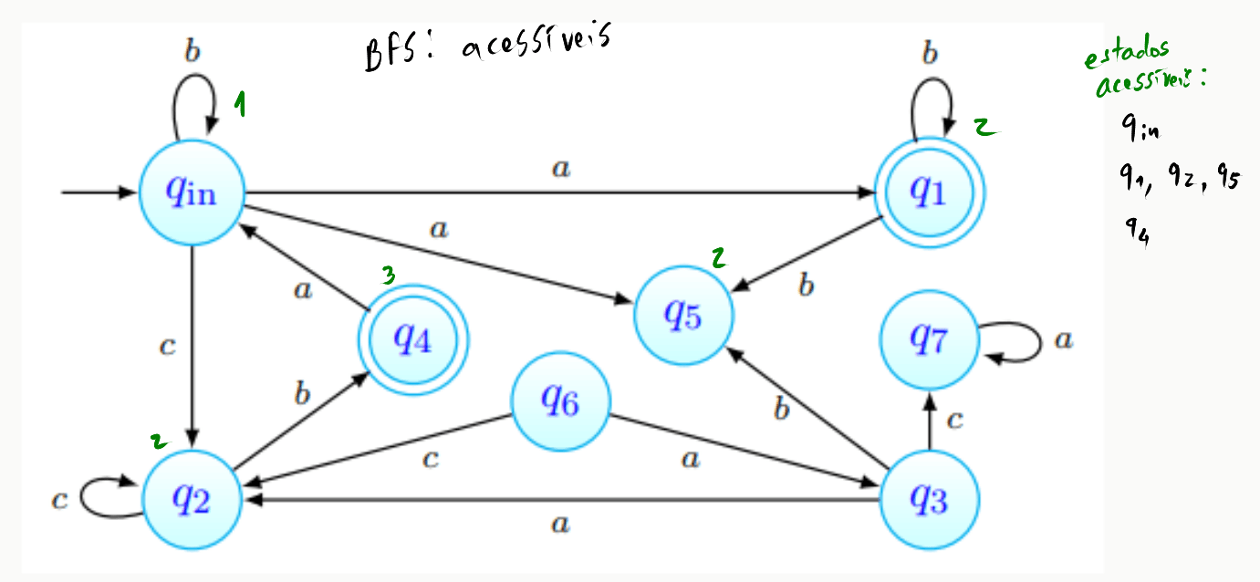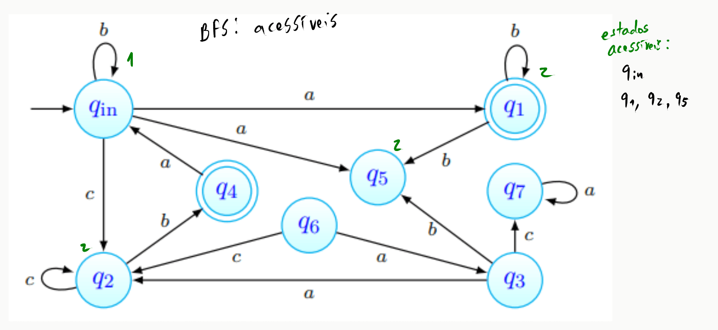 - Numa primeira fase (passos 1 a 3), vamos descobrir quais são os estados acessíveis. Intuitivamente, podemos fazer isto começando em e fazendo uma procura (BFS) no grafo do AFD. À medida que o fazemos, colocamos esses estados no conjunto de estados acessíveis;