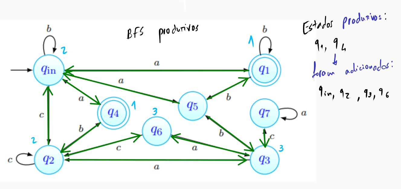 De seguida, determinar os estados produtivos: fazer BFS's, partindo de cada estado final, pelo "autómato transposto":